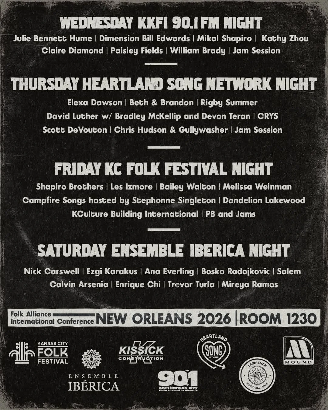 NEWS! KC Folk Fest is headed to New Orleans for the 2026 Folk Alliance International Conference, January 21-25. We'll be co-hosting the KC Room with local partners Heartland Song Network and KKFI 90.1 FM, while repping KC area artists and our own brand of hospitality including Doña Fina Café and Jack Stack BBQ! Going to FAI? Come find us this week in the Kansas City Room #1230 at the Sheraton New Orleans!